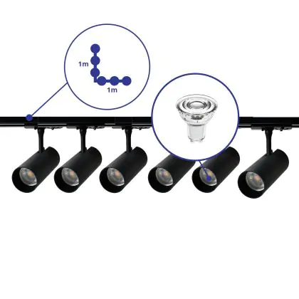 Beschrijving Complete Set 1-Fase Rail L 1 x 1 Meter Zwart | incl. 6x Spot + GU10 2700K 3W Dimbaar + Eindkap, Voedingsconnector en L -Verbindingsstuk