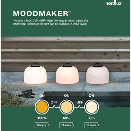 De draagbare Nordlux Kettle 36cm is een prachtige lamp die je kunt plaatsen waar je deze op dat moment nodig hebt. In een boom, op de vloer, op het terras of op tafel. Het is allemaal mogelijk. Deze IP65 buitenlamp is gemaakt van hard plastic, waardoor deze goed bestand is tegen wind en water.