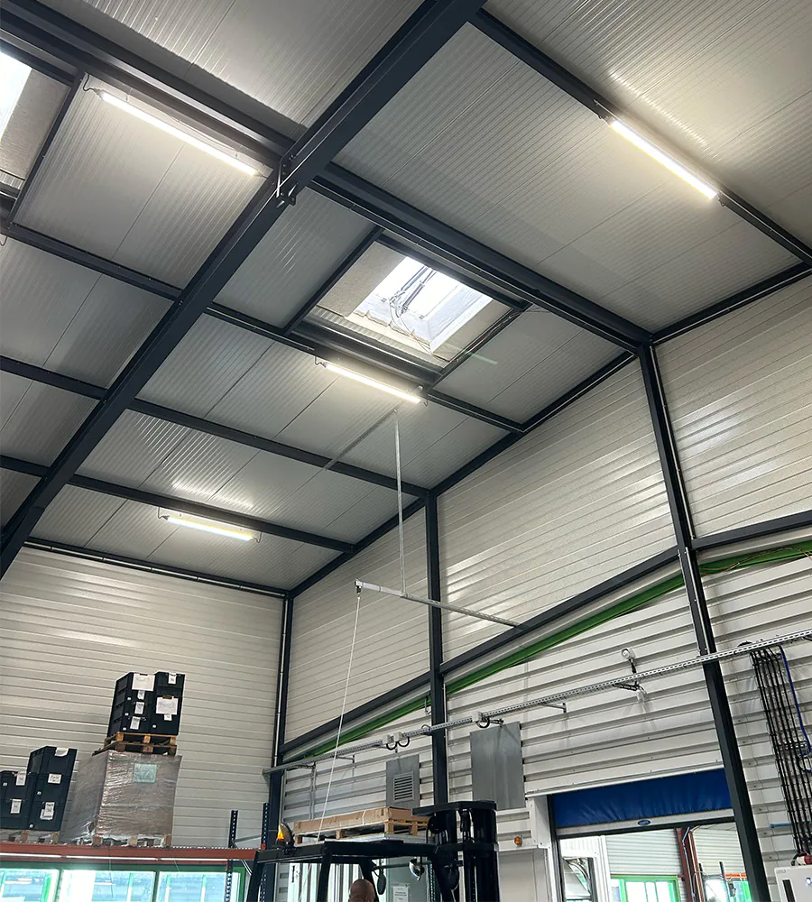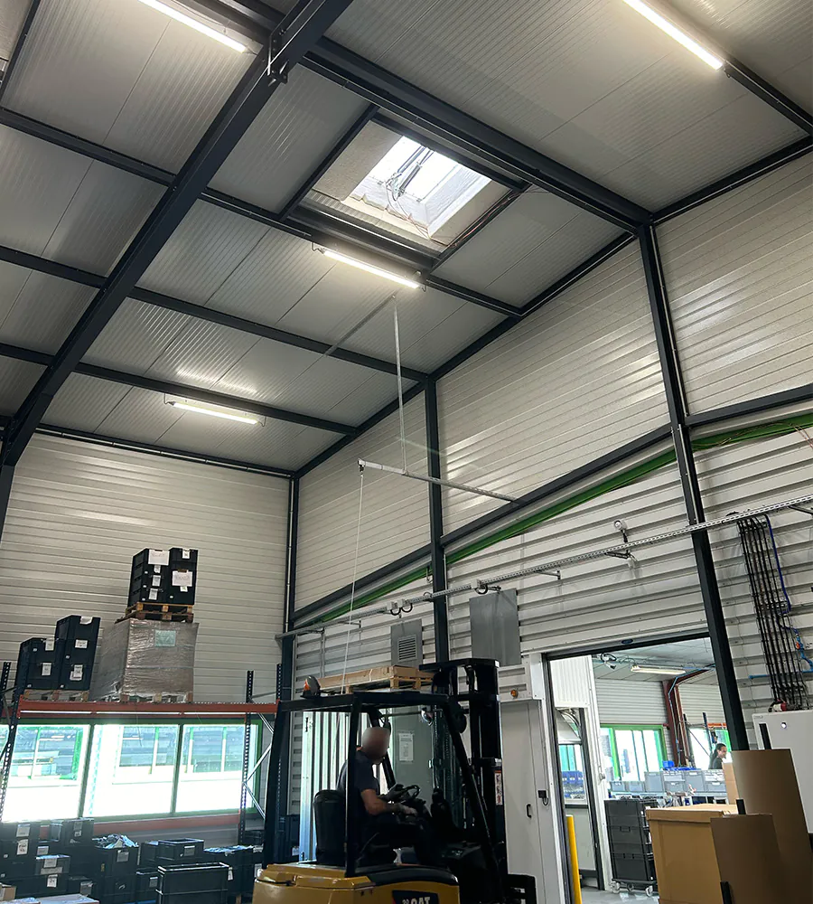 Onze projectadviseur stelde daarom een dubbele verlichtingsoplossing voor: krachtige LED verlichting voor de werkzones en meer diffuse verlichting voor de opslagruimtes.